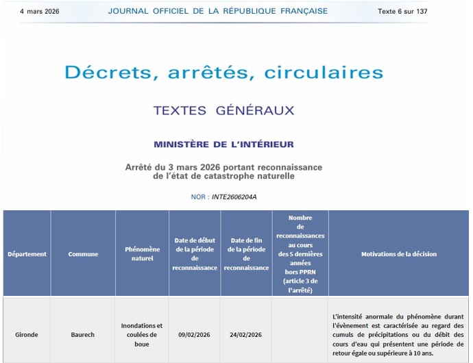 reconnait officiellement l’état de catastrophe naturelle pour la commune de Baurech