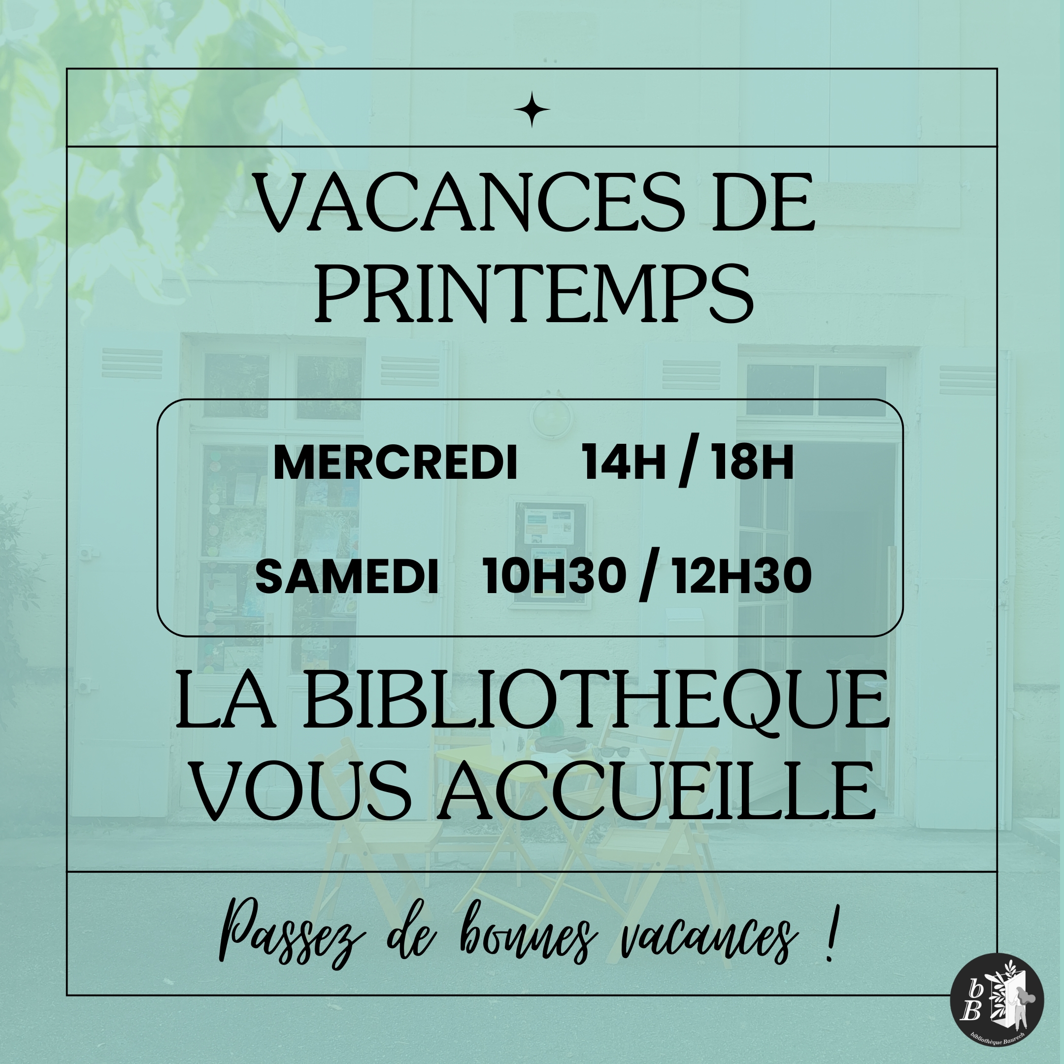 Votre bibliothèque est ouverte pendant les vacances. Attention ! Les horaires changent légèrement : mercredi de 14h à 18h et samedi de 10h à 12h.