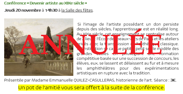 ‼️❌ La Conférence « Devenir artiste au XIXe siècle » est annulée