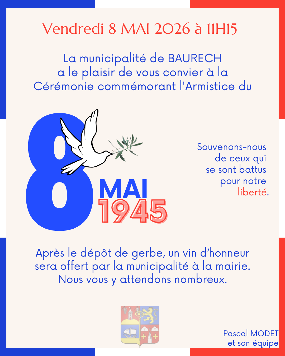 Le maire Pascal MODET et la municipalité vous invite à participer à la cérémonie de commémoration de la Victoire du 8 mai 1945.